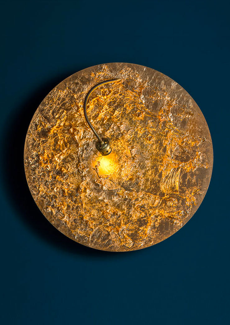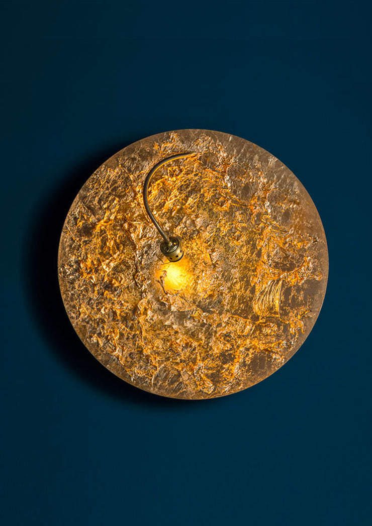 Formed by an integrated LED directional spotlight and a gold leaf disc available in 80 cm or 120 cm diameter.