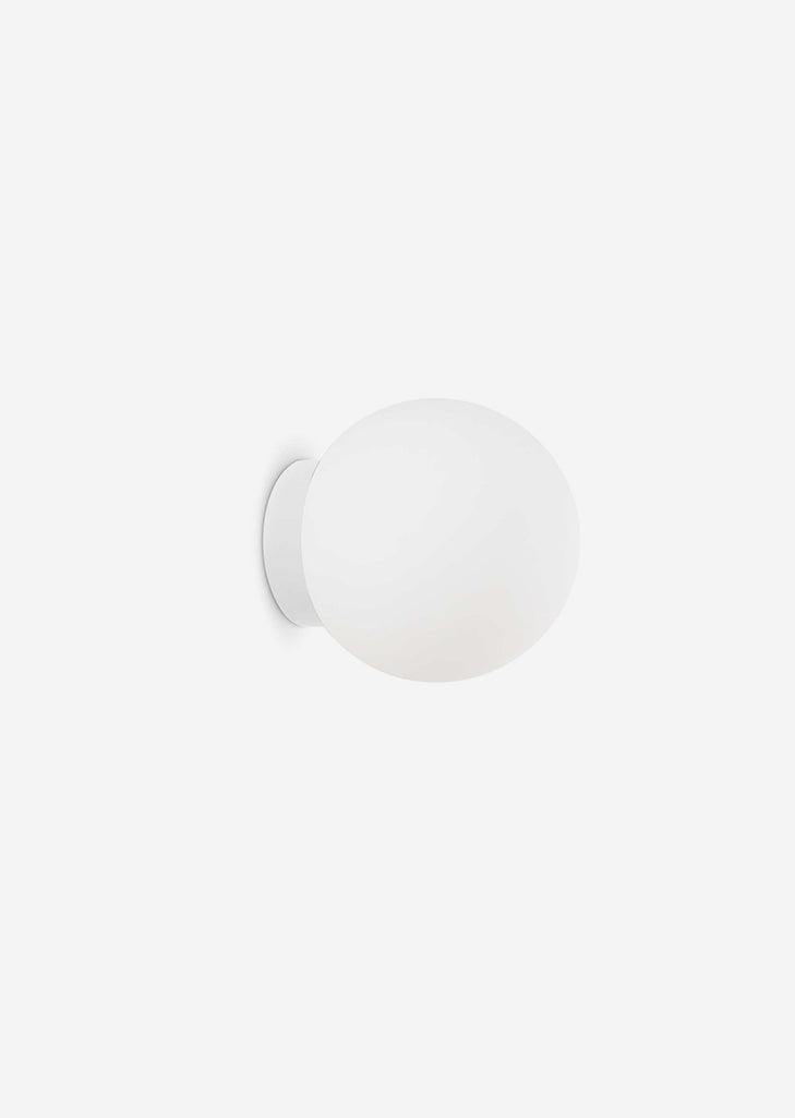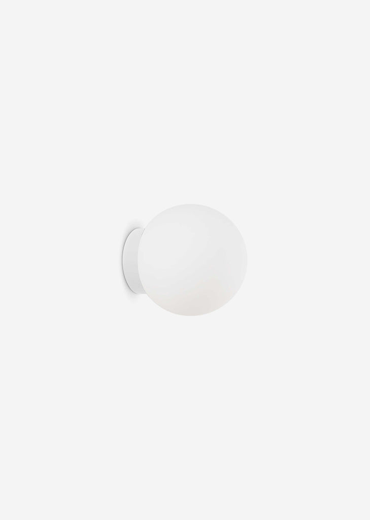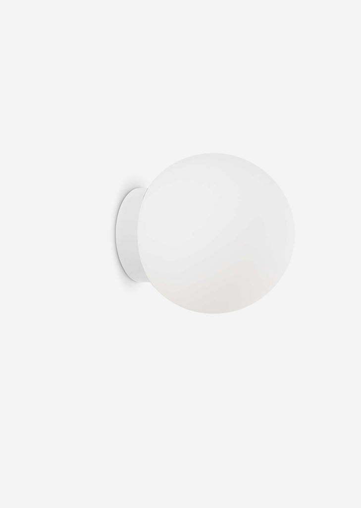 Lampada da parete con diffusore a sfera in vetro bianco soffiato e acidato.