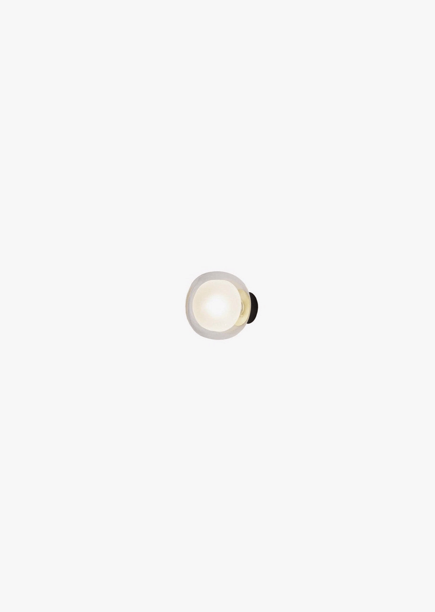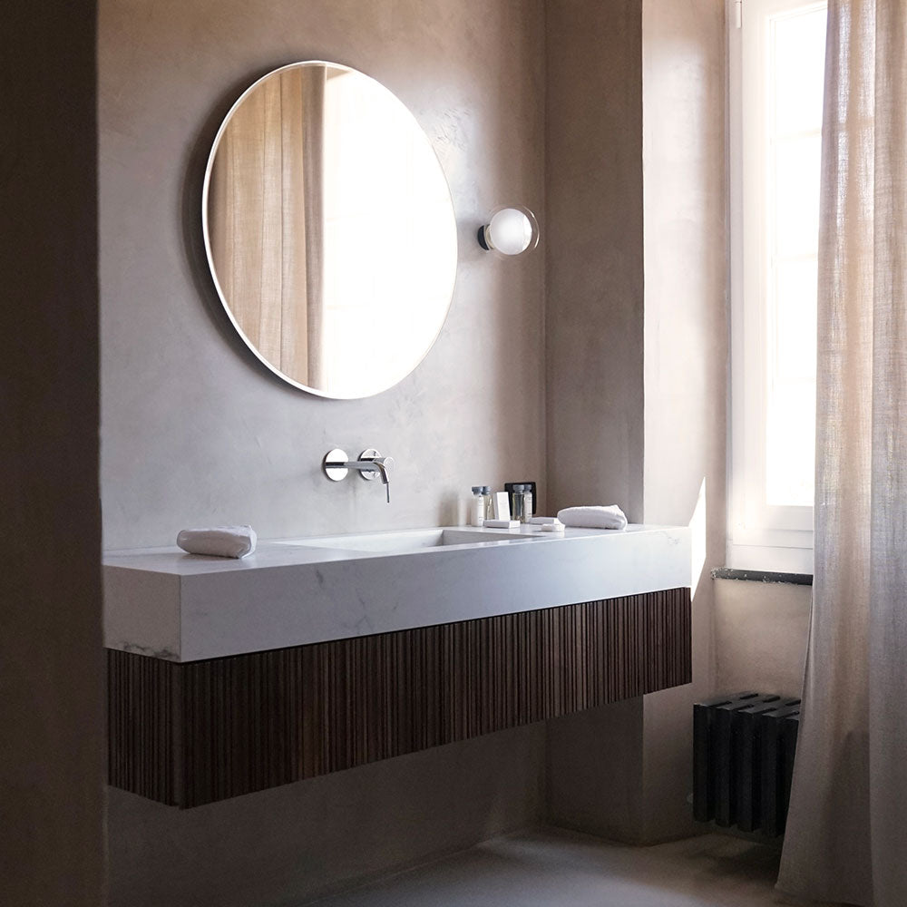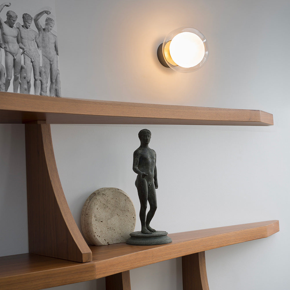 - Corpi luminosi sferici: due diffusori in vetro borosilicato a doppia parete, disponibili in finiture trasparente o fumé, con un diametro di 12 cm.