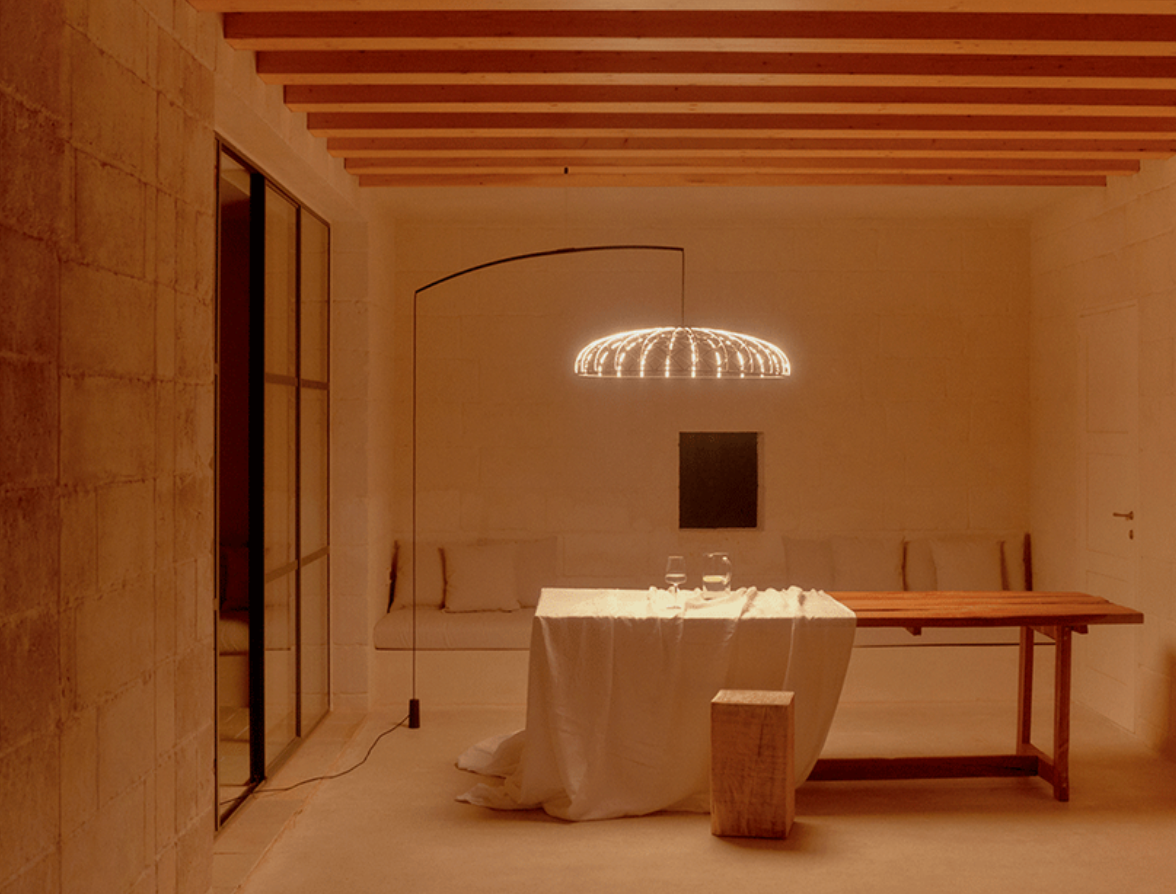 The new Skynest C suspension lamp by Flos is powered by special micro connectors in the upper part of the dome, and is covered with a two-tone mesh, with the side oriented towards the inside of the dome always white, so as to allow for optimal emission light of the led module.
