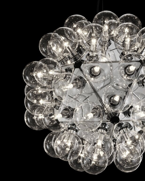With a daring yet simple technical solution: 20 triangular plates in polished chrome-plated aluminium, assembled in a compact core to each house three luminous globes, for a total of 60 Globolux bulbs.