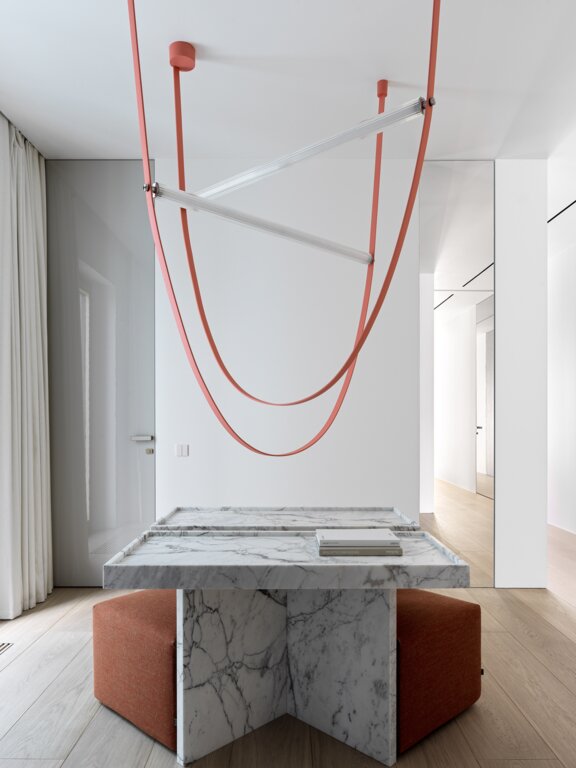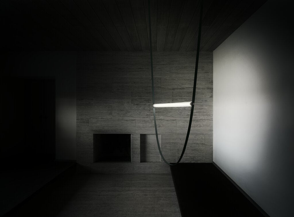 Wireline suspension lamp with diffused light by Flos , tubular in transparent extruded glass and internal diffuser in opal PC.