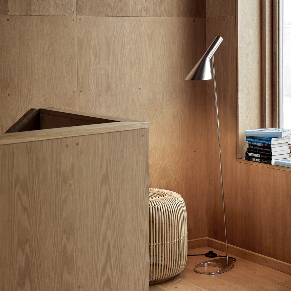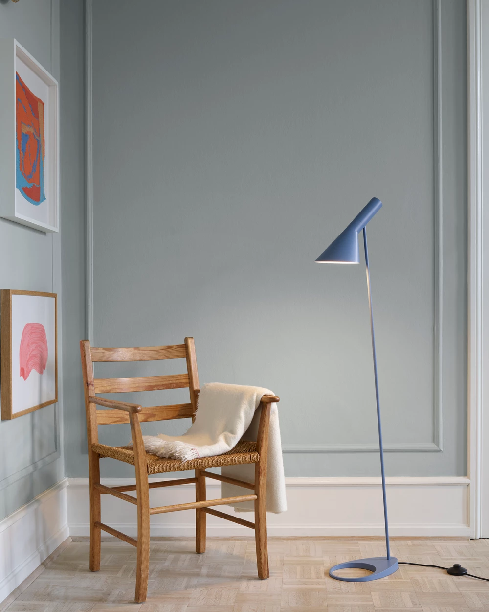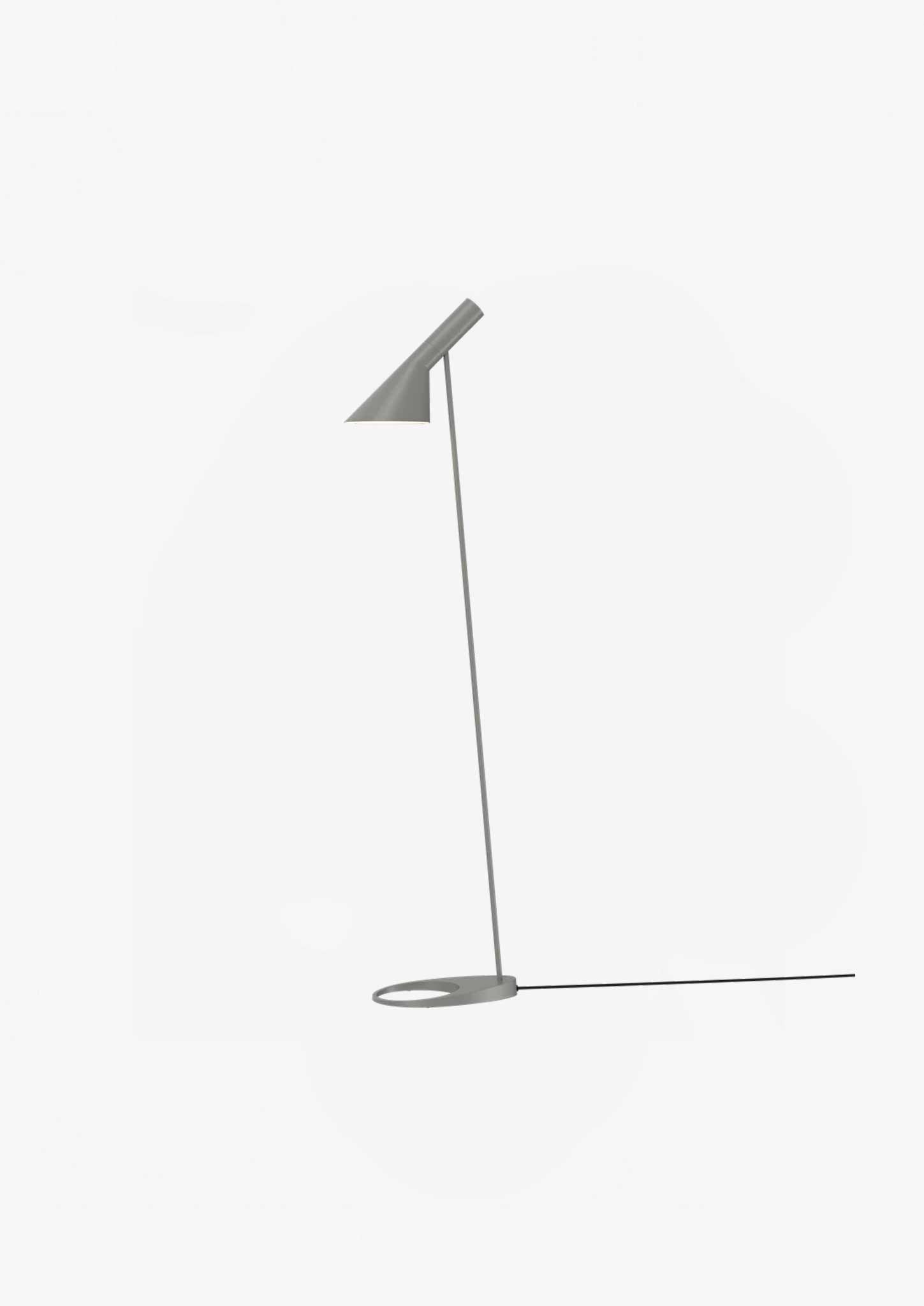 Arne Jacobsen ha progettato questo apparecchio per il SAS Royal Hotel di Copenaghen nel 1957. La lampada da terra produce una piacevole luce diretta verso il basso con lo schermo interno verniciato bianco. Lo schermo può essere inclinato per regolare la distribuzione della luce.