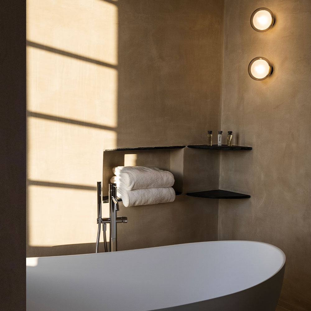 - Corpi Luminosi Sferici: Dotata di due corpi luminosi sferici in vetro borosilicato a doppia parete, disponibili in finiture trasparenti o fumé, con un diametro di 16 cm.