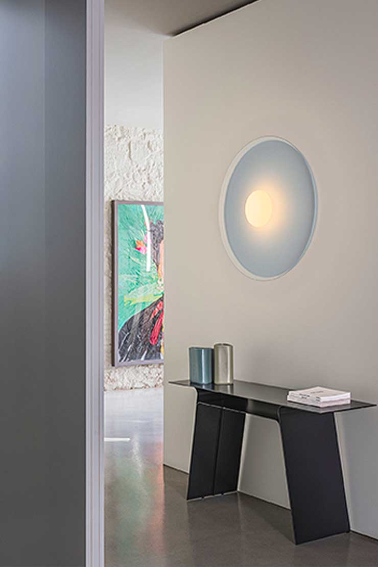 Scopri la lampada da parete Top 1155 di Vibia, un'illuminazione che unisce eleganza e minimalismo. Caratterizzata da una piccola sfera centrale che riflette la luce su un grande disco di 40 cm di diametro, questa lampada crea un effetto luminoso unico.