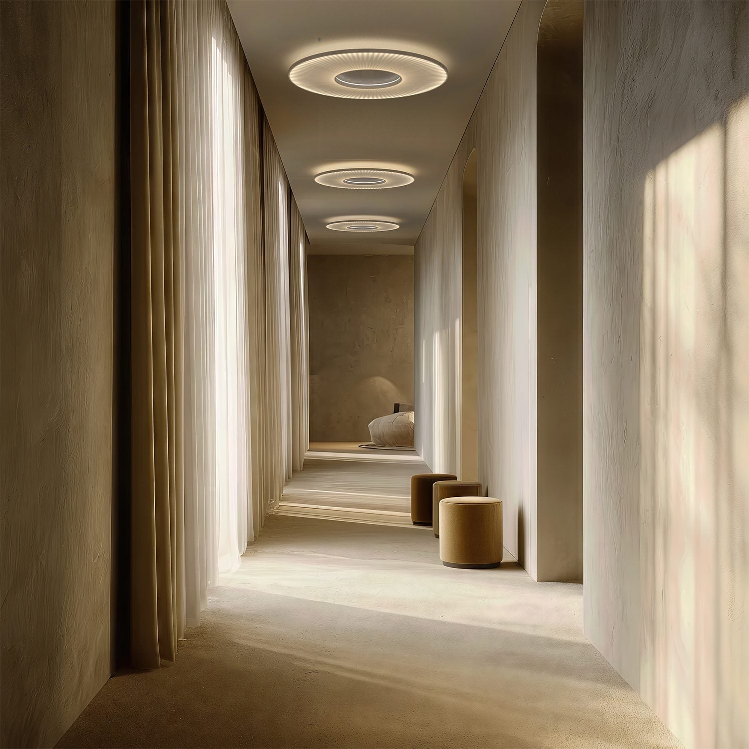 Realizzata con un disco centrale bianco e un nastro che ne enfatizza l’emissione luminosa, IRIS CEILING diffonde una luce potente, morbida e uniforme — «una luce che ricorda un sole» nelle parole del designer Fabrice Berrux — e si inserisce con armonia in contesti residenziali e contract.