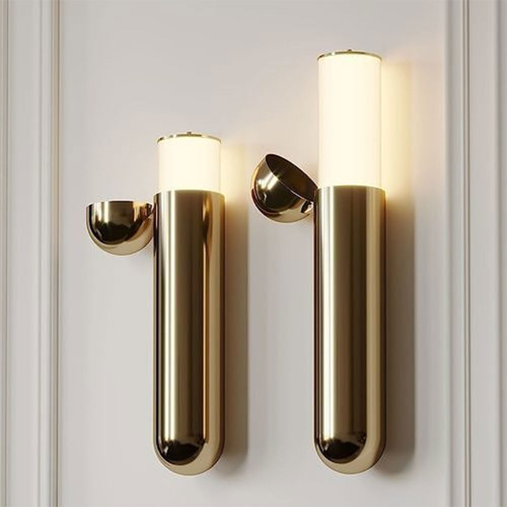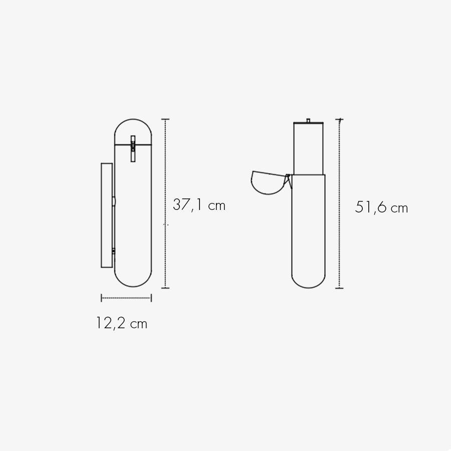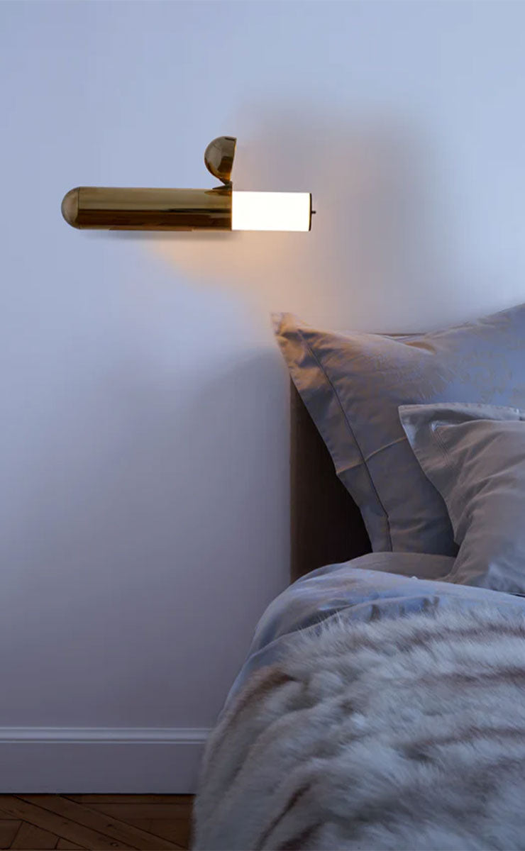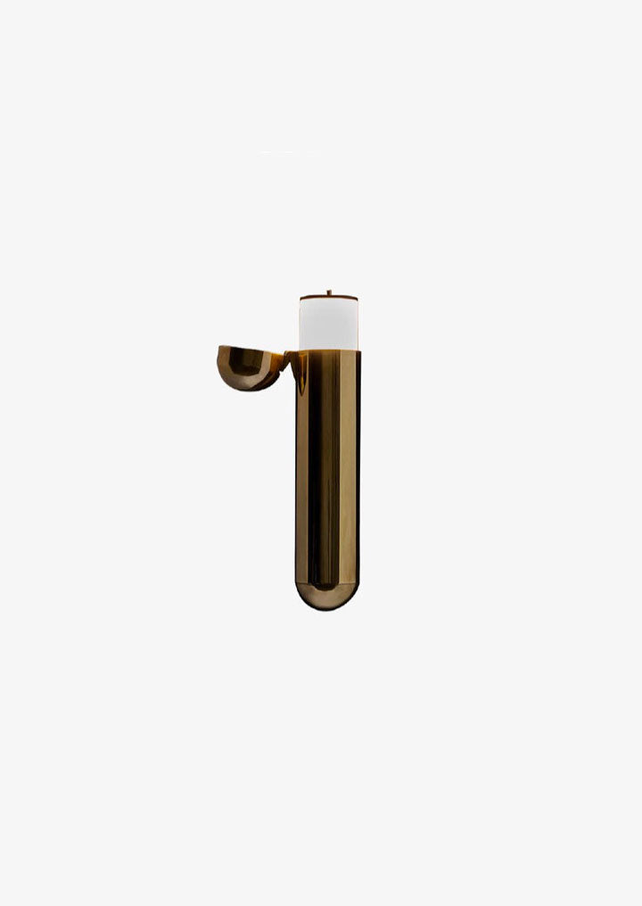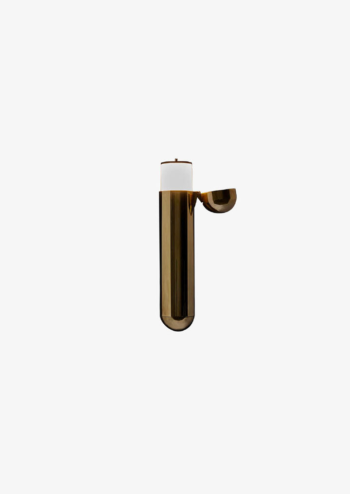 Caratterizzata da un tubo cilindrico in ottone, la lampada può essere montata sia in posizione orizzontale che verticale, adattandosi a ogni spazio. Un tappo a cerniera su un'estremità permette un accesso pratico al diffusore interno, che ospita un LED integrato.