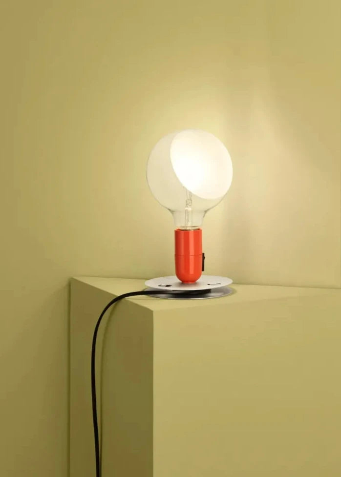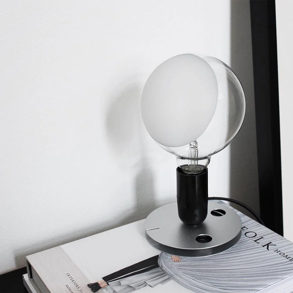 Lampadina è la lampada da tavolo a luce diretta/diffusa con la base in alluminio anodizzato, avente anche la funzione di riavvolgitore del cavo elettrico, una grande lampadina globolux in vetro trasparente, con una parziale sabbiatura su un lato della sfera, e la funzione ON/OFF con un interruttore collocato sul supporto lampada, manovrabile dall'esterno.