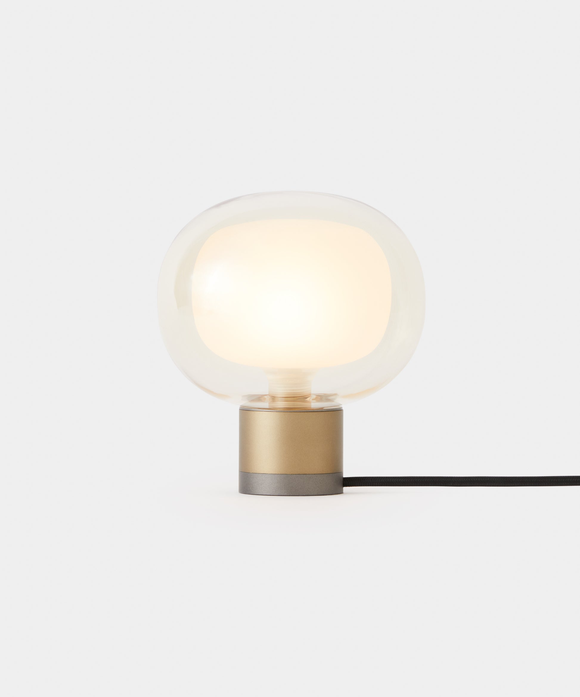 Lampada da tavolo dal design sofisticato con diffusore sferico in vetro borosilicato a doppia faccia, disponibile in diverse composizioni.