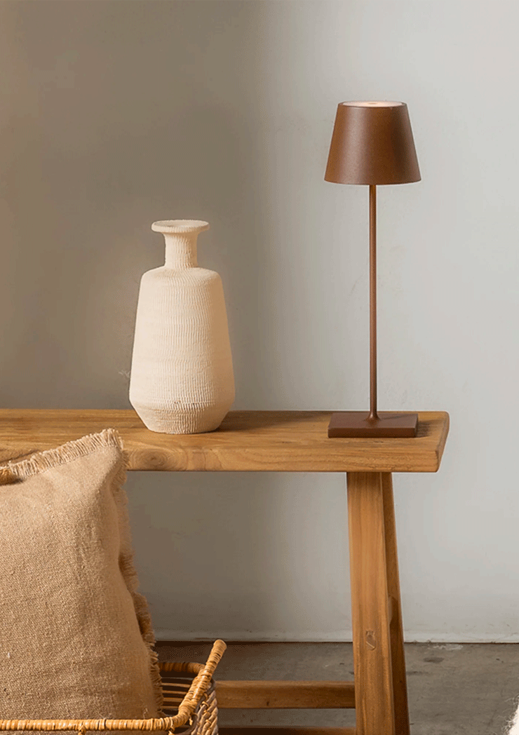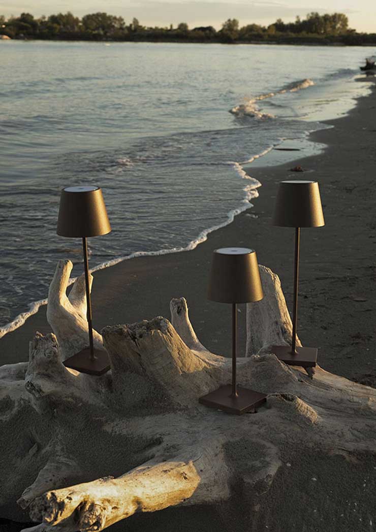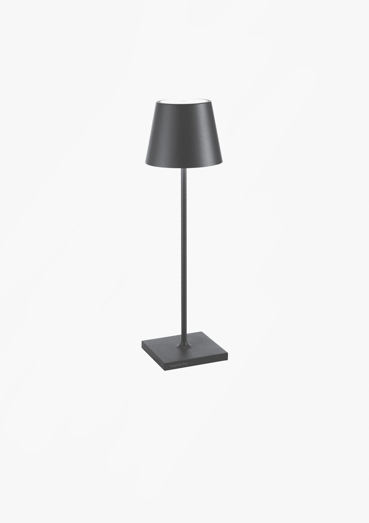 Realizzata in alluminio verniciato, Poldina PRO offre un look elegante e moderno. La sua base di ricarica a contatto la rende estremamente pratica e versatile.