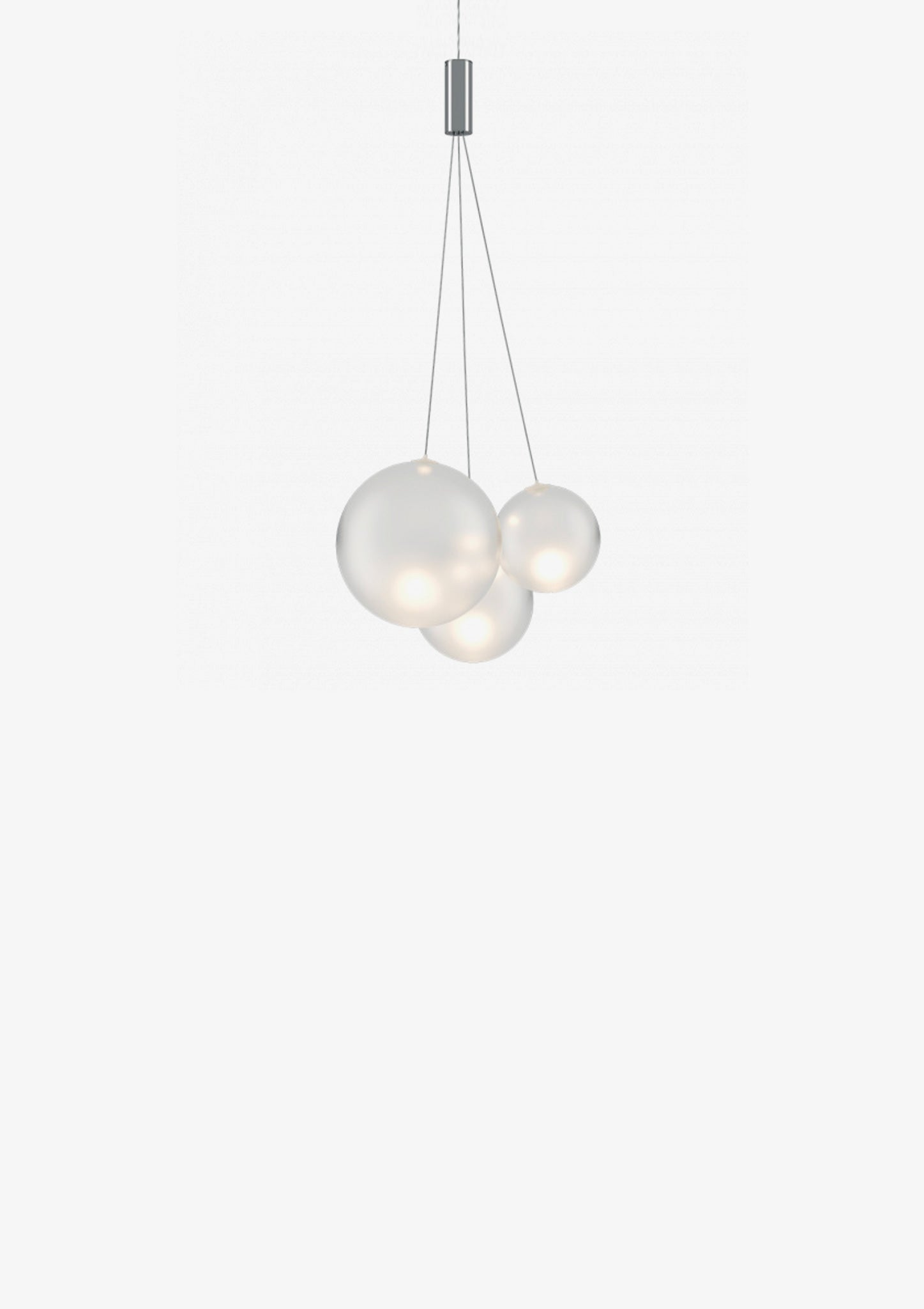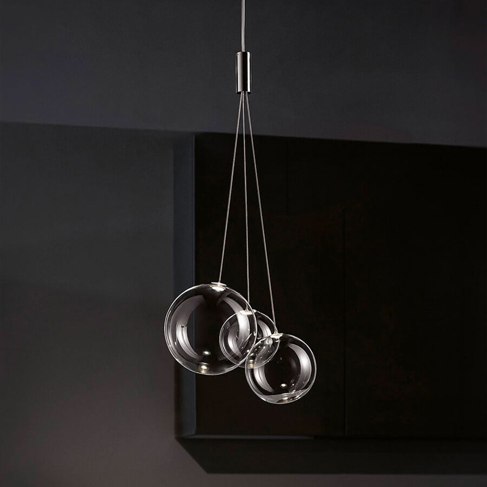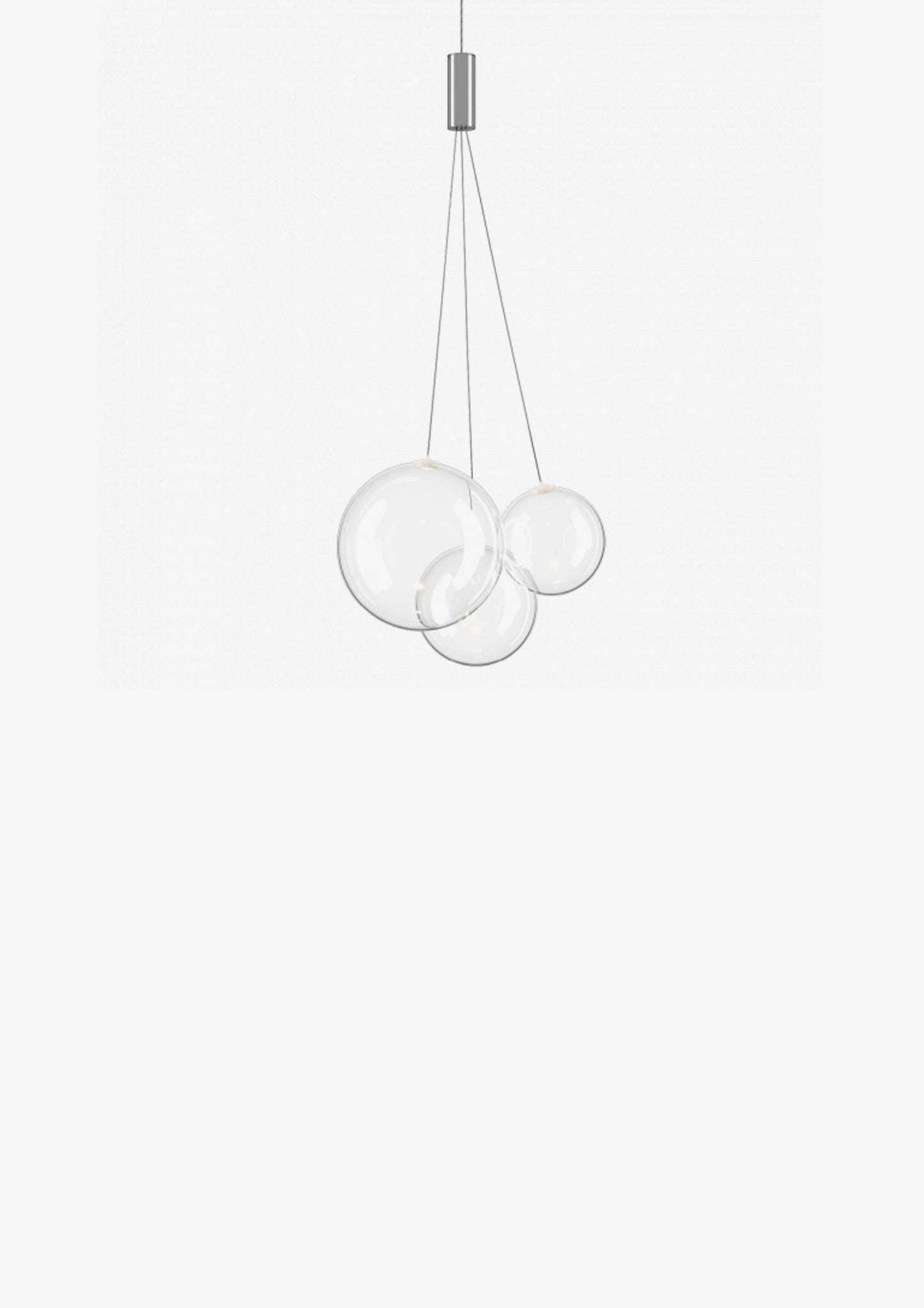 Scopri l'eleganza della lampada a sospensione composta da tre diffusori sferici in vetro soffiato, disponibili in versione trasparente o colorata. Ogni diffusore è dotato di una sorgente luminosa a LED integrato, che offre una luce calda e accogliente per un'atmosfera unica.