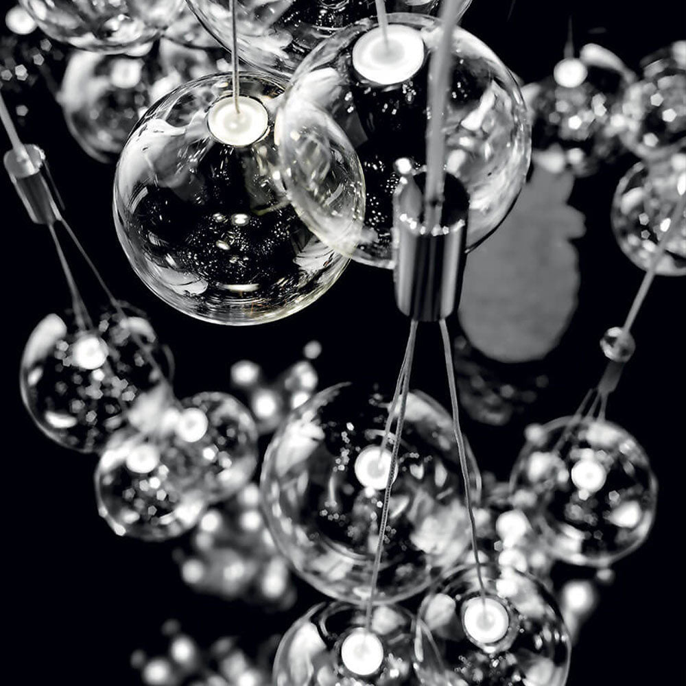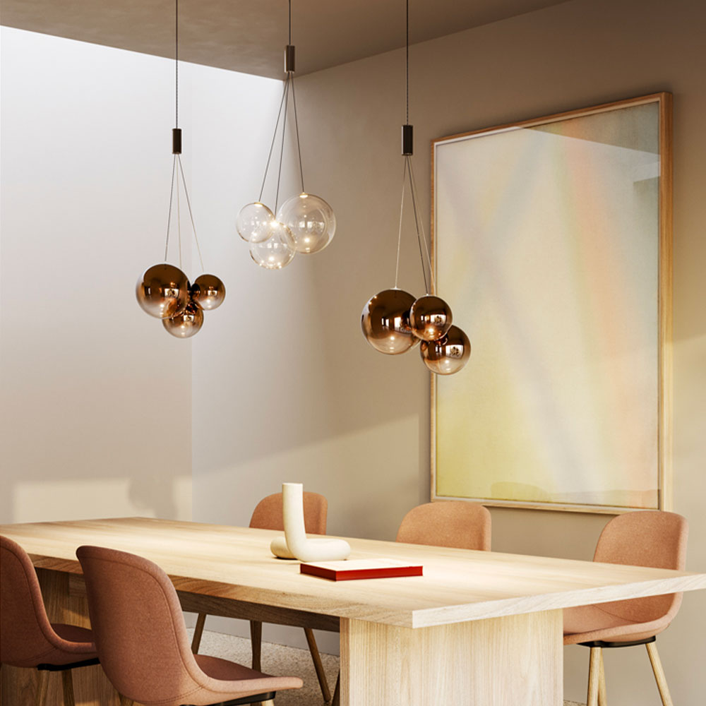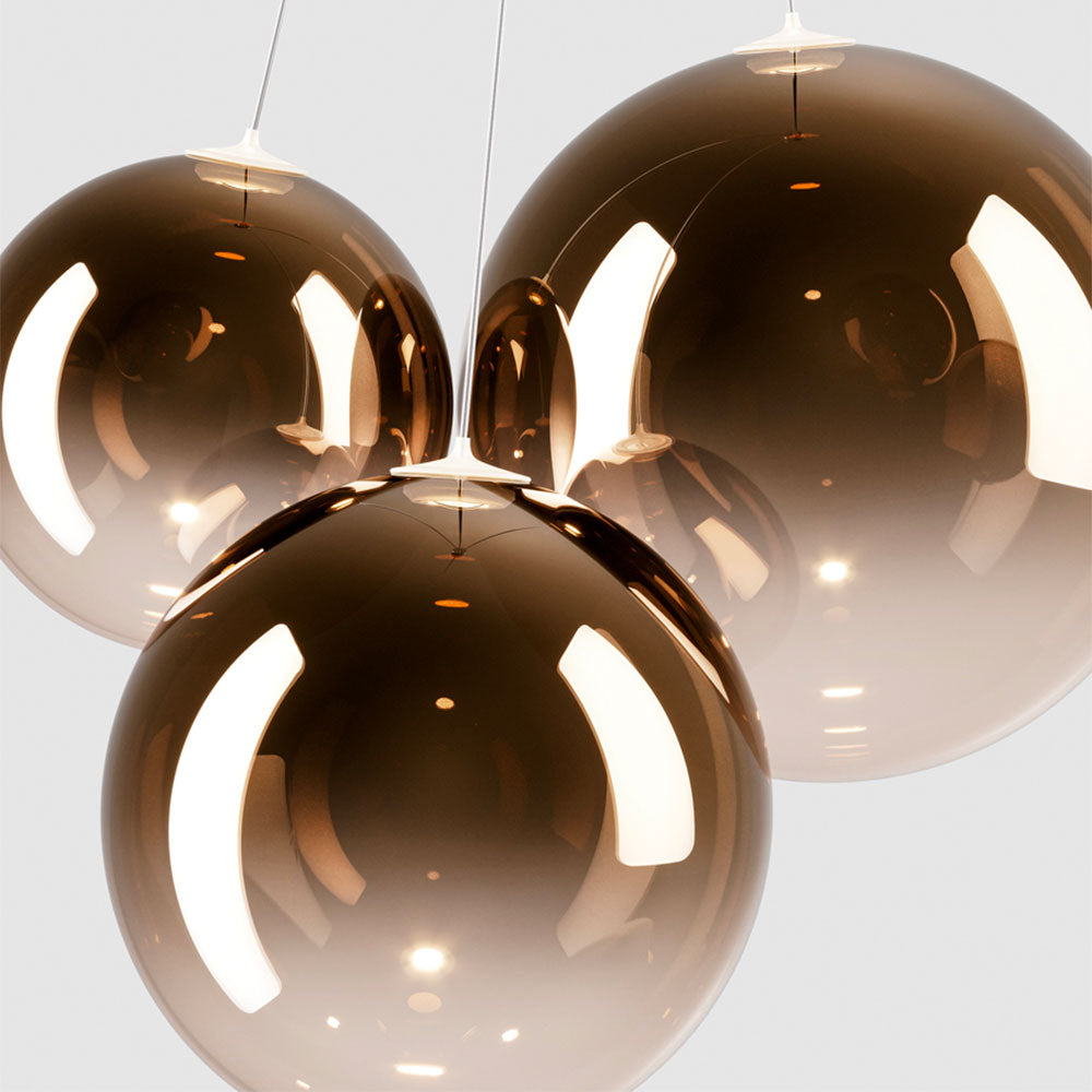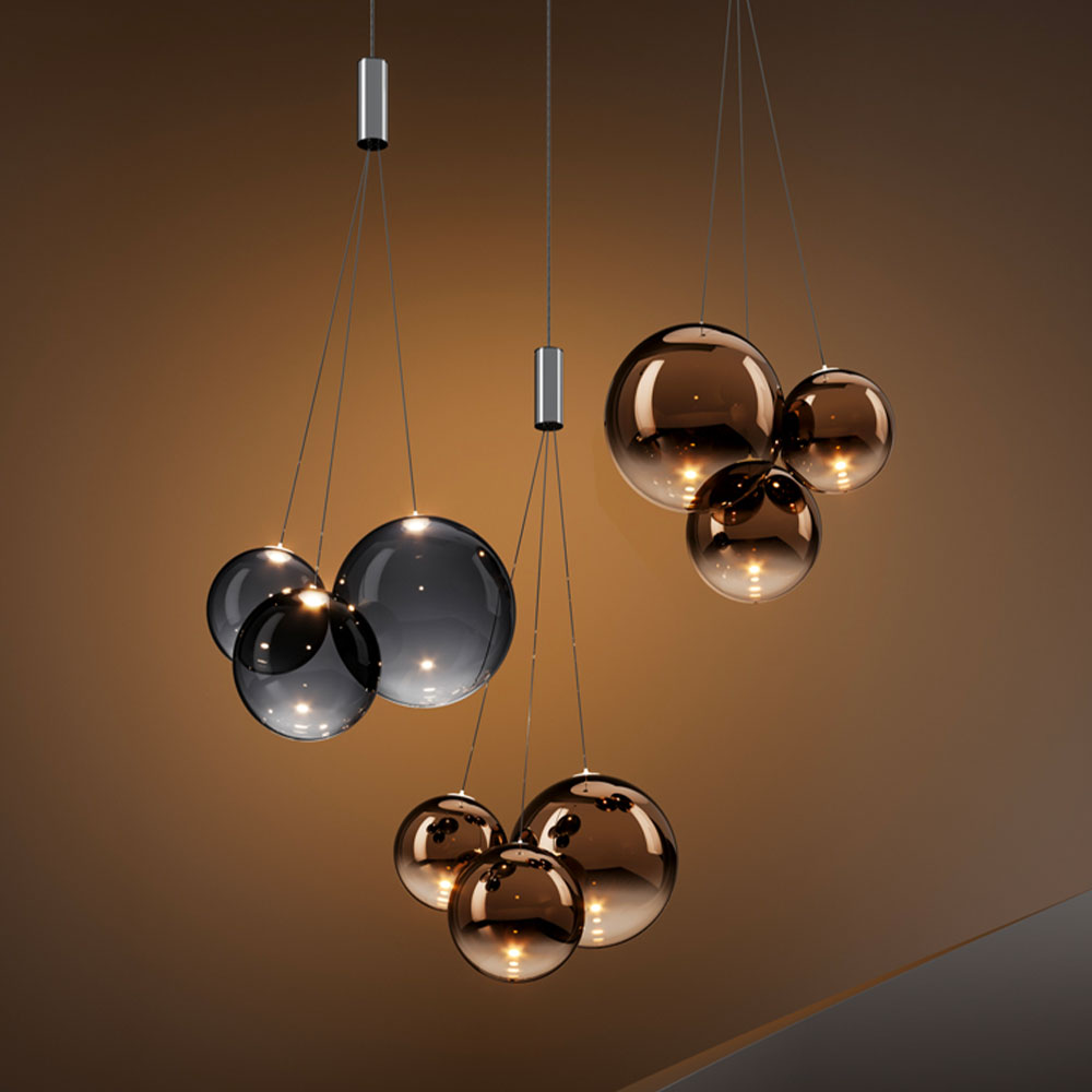 Scopri l'eleganza della lampada a sospensione composta da tre diffusori sferici in vetro soffiato, disponibili in versione trasparente o colorata. Ogni diffusore è dotato di una sorgente luminosa a LED integrato, che offre una luce calda e accogliente per un'atmosfera unica.