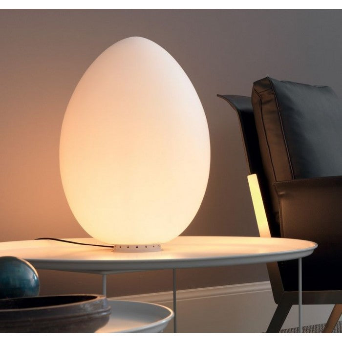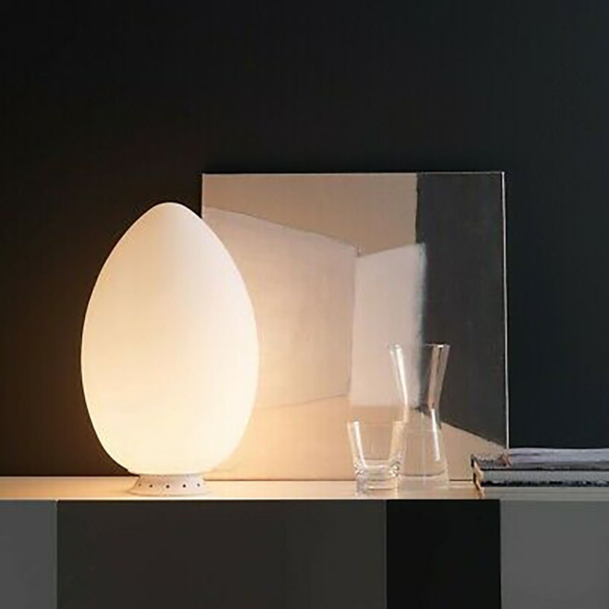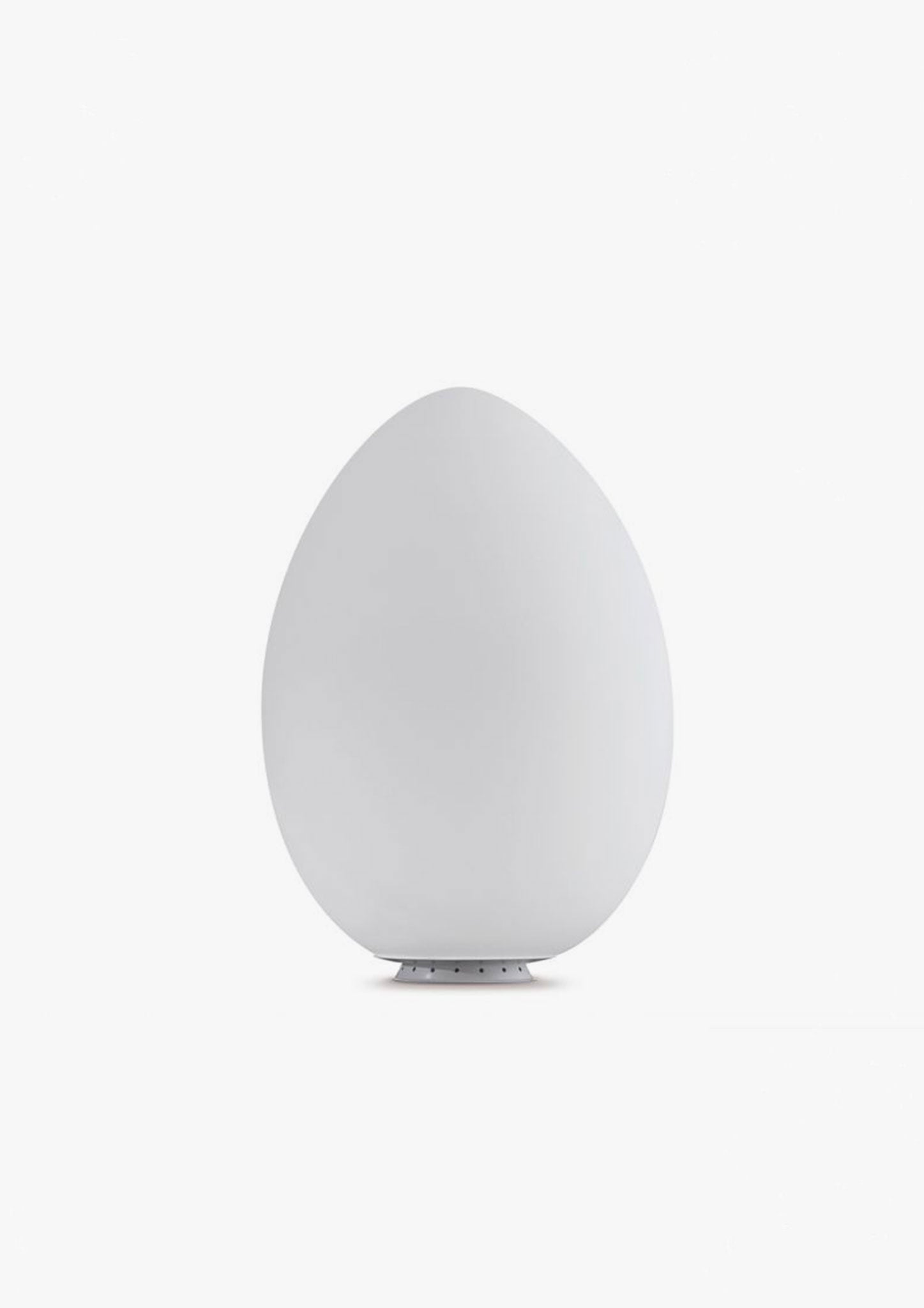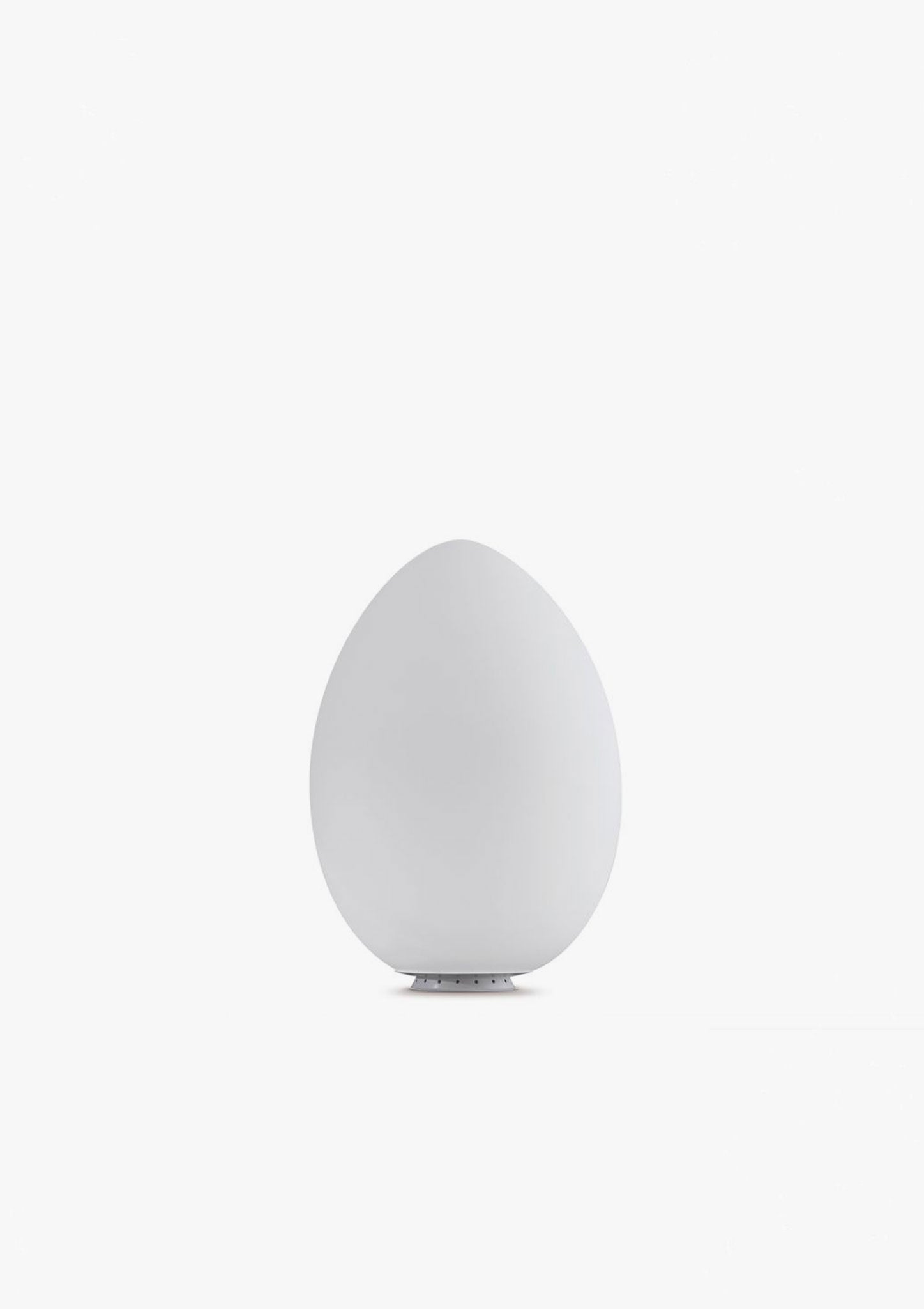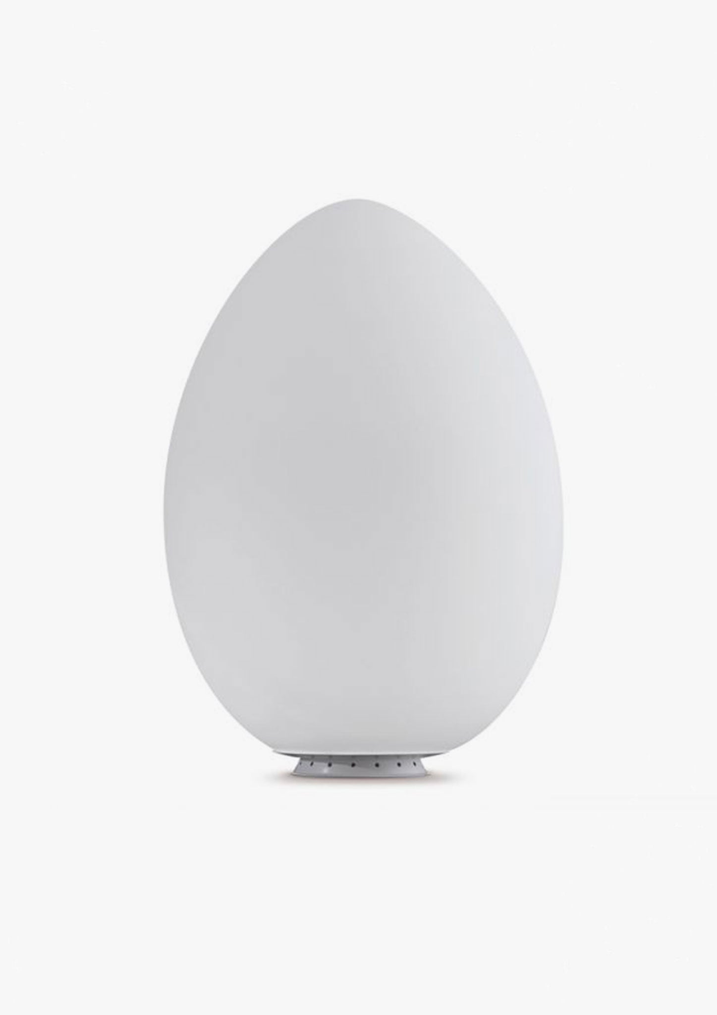 Disegnato nel 1972, il guscio contiene una fonte luminosa: un’idea ironica che ancora oggi conquista. Come in natura, anche nella lampada Uovo il guscio è esempio assoluto di leggerezza: una forma elegante in vetro soffiato bianco satinato, che diffonde uniformemente una luce calda e avvolgente. Nelle tre dimensioni disponibili c’è tutta la versatilità di una collezione pensata per più destinazioni d’uso: da minuta lampada di servizio – nella versione più piccola – a scultura luminosa, protagonista dello spazio, nella versione più grande.